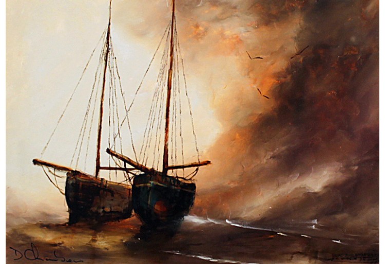 Two Boats, Copper Sky - Oil on Board - 29 x 21cm - inc Frame 45 x 36.5cm SOLD
