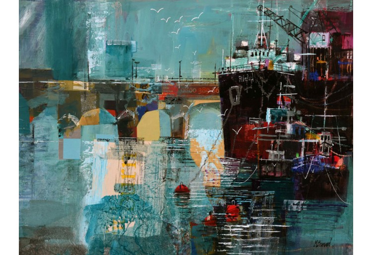 Tags: Mike Bernard RI, collage, mixed media, coastal, quayside, boats, Bideford, Devon, marine art, British art, contemporary, textured, impressionistic, water reflections, harbour life
