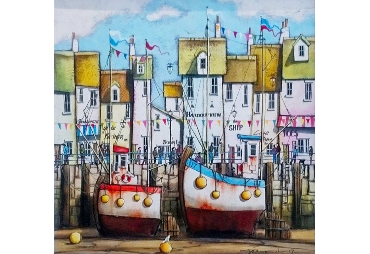 The Harbour in Summer - mixed media on board - 24.75 x 24.75 inch - inc Frame SOLD