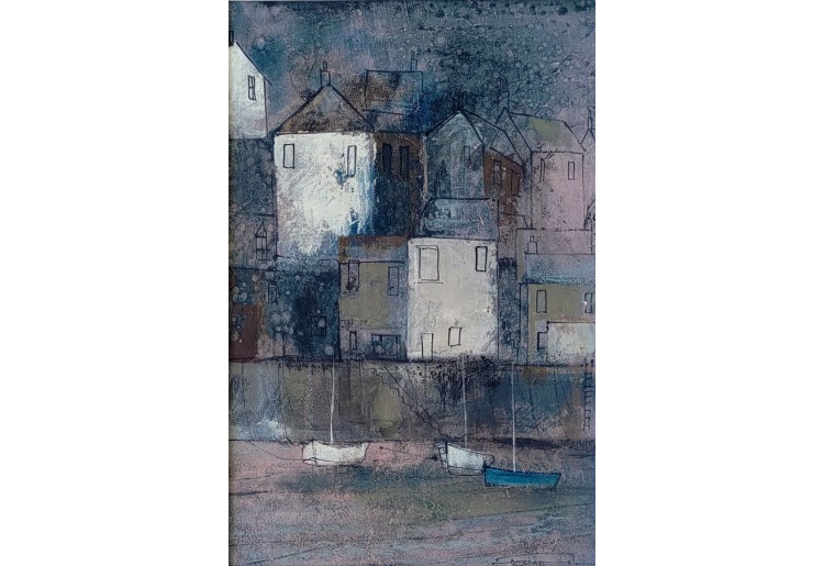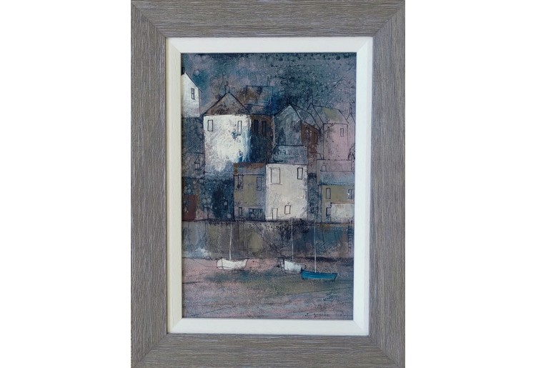 Working in a muted, earthy palette, Dale layers paint and mixed media to create rich, tactile surfaces with a timeless quality. The result is a collection that feels both grounded and dreamlike, filled with the whispers of sea air, peeling paint, and the gentle stillness of forgotten quaysides.